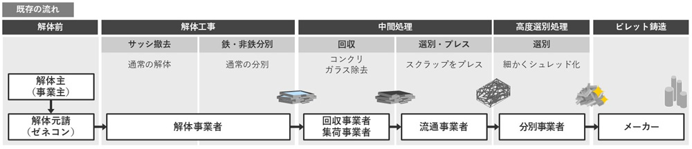 従来は、解体工事(サッシ撤去、鉄・非鉄分別)、中間処理(回収、選別・プレス)、高度選別処理といった各工程が個社で分断されているため、リサイクルアルミ原材料のトレーサビリティの確保が難しく、高品質なアルミサッシ原料として十分に活用されていないケースが見受けられました。