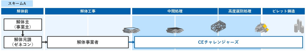 | スキームA : | 解体事業者がサッシ撤去と基本的な分別を行った後、「CEチャレンジャーズ」が中間処理から高度選別処理、製品化までを一貫して担当 |