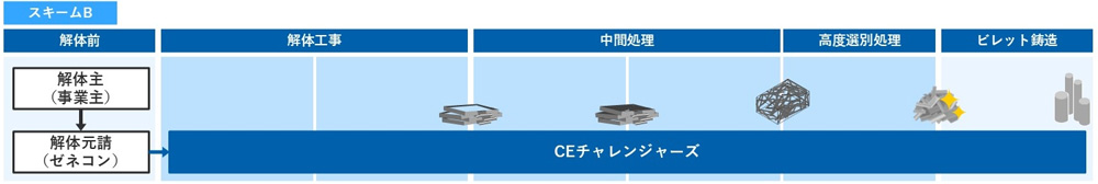 | スキームB : | 解体現場からサッシ撤去作業、中間処理、高度選別処理、製品化までを「CEチャレンジャーズ」が一貫して担当 |