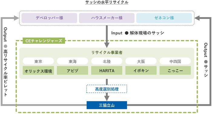 「CEチャレンジャーズ」では、事業者間の連携により、一貫した資源回収・リサイクルシステムを構築します。これにより、トレーサビリティの確保が可能になり、脱炭素化に取り組む事業者が求める、信頼性の高い環境配慮型製品へのニーズに対応します。さらに、アルミサッシの回収率向上と高品質なリサイクル原料の安定確保を実現します。