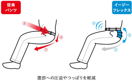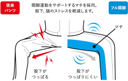 - 腰への負担を軽減する幅広ウエスト設計と腰部保護一体型パンツ
