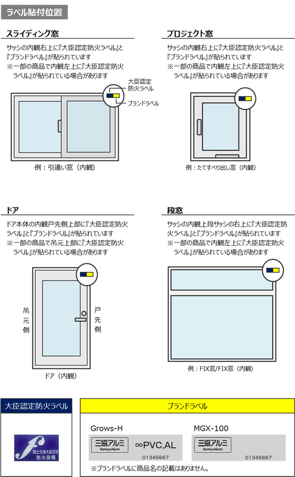 下図、製品ごとのブランドラベルの見方を参照のうえ「大臣認定防火ラベル」及び「ブランドラベル」をご確認ください。