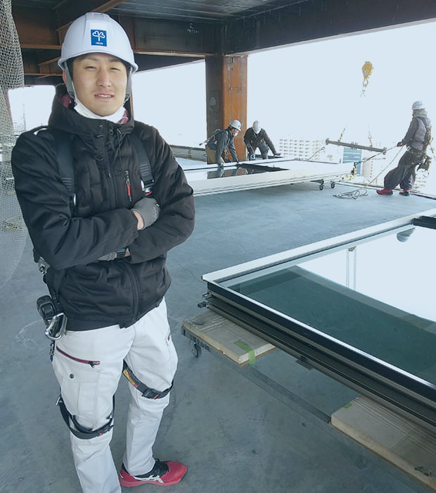 Mさん : 私たちは同じ施工管理部で働く先輩・後輩です。同部では東京都内の低層から大型案件まで、ビルの多種多様なサッシの取り付け工事を担当しています。ゼネコンの担当者をはじめ、本社・工場の生産部門や実際に施工する職人さんなどと工程や納期の確認・調整をしながら、計画どおりに工事を完了できるよう現場で全般的な管理を行っています。
