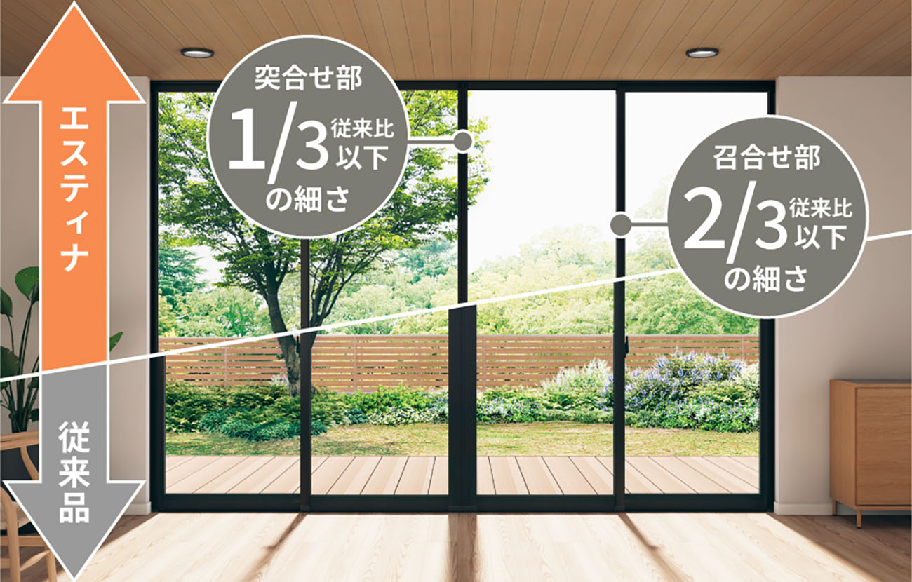 隠し框の採用や下枠戸車の小径化など独自の設計手法により、業界トップクラスのスリムなフレームを実現。