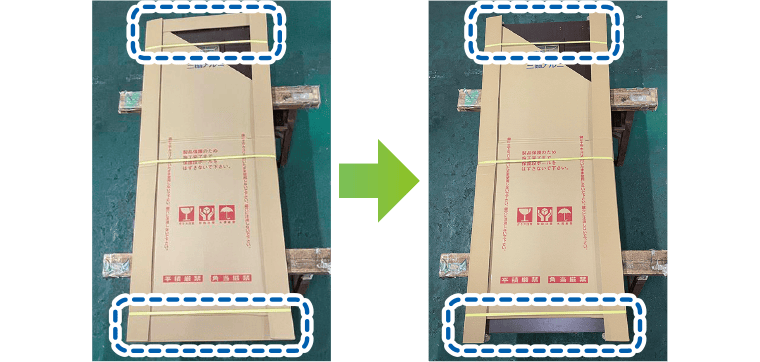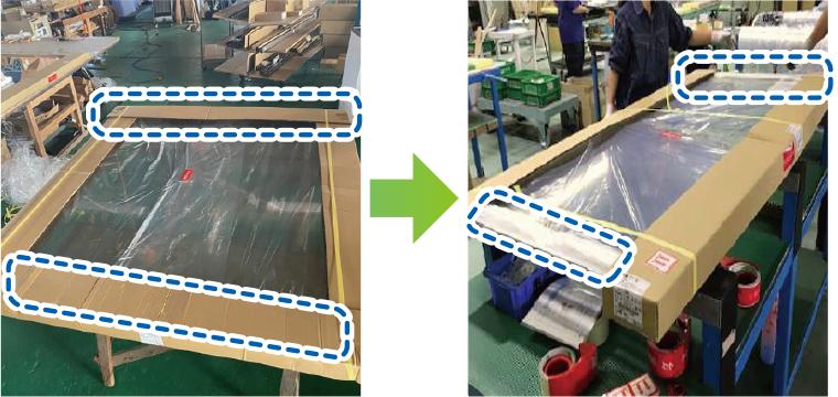 玄関ドア上下框の破損防止用の緩衝材として使用していた上下の積層ダンボールを削減